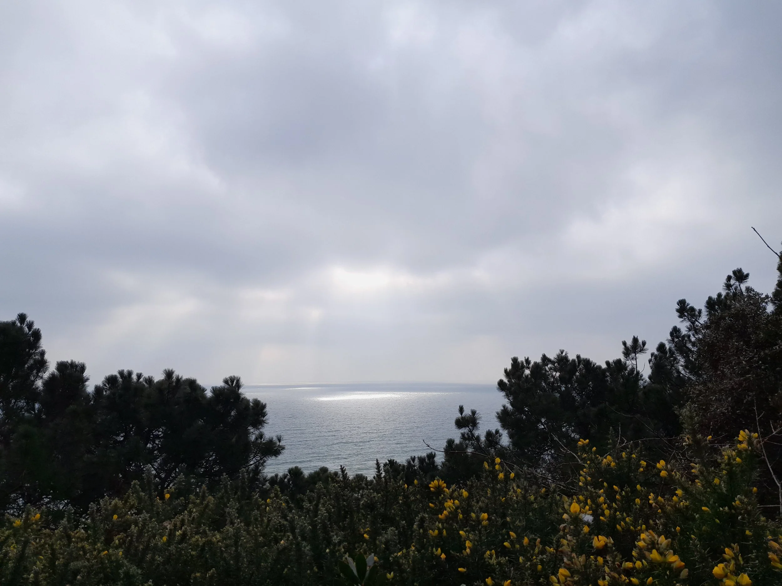 Still cold beneath a lumpy grey sky. The sun occasionally making a dart of light onto the ruffled sea. Some lads, tired of the winter have decided to come out and play frisbee. A walker saunters past talking loudly and gesticulating. And further along another and another. Once we would have taken this as disturbed and disturbing activity, nowadays we take it for granted that they’d rather converse with their Blue Tooth than engage with the world they’re actually in. Once or twice the sun manages to struggle out and there is blue sky over the town but a fine mist drifts in from the bay and the warmth is fleeting. Gulls circle overhead silently.